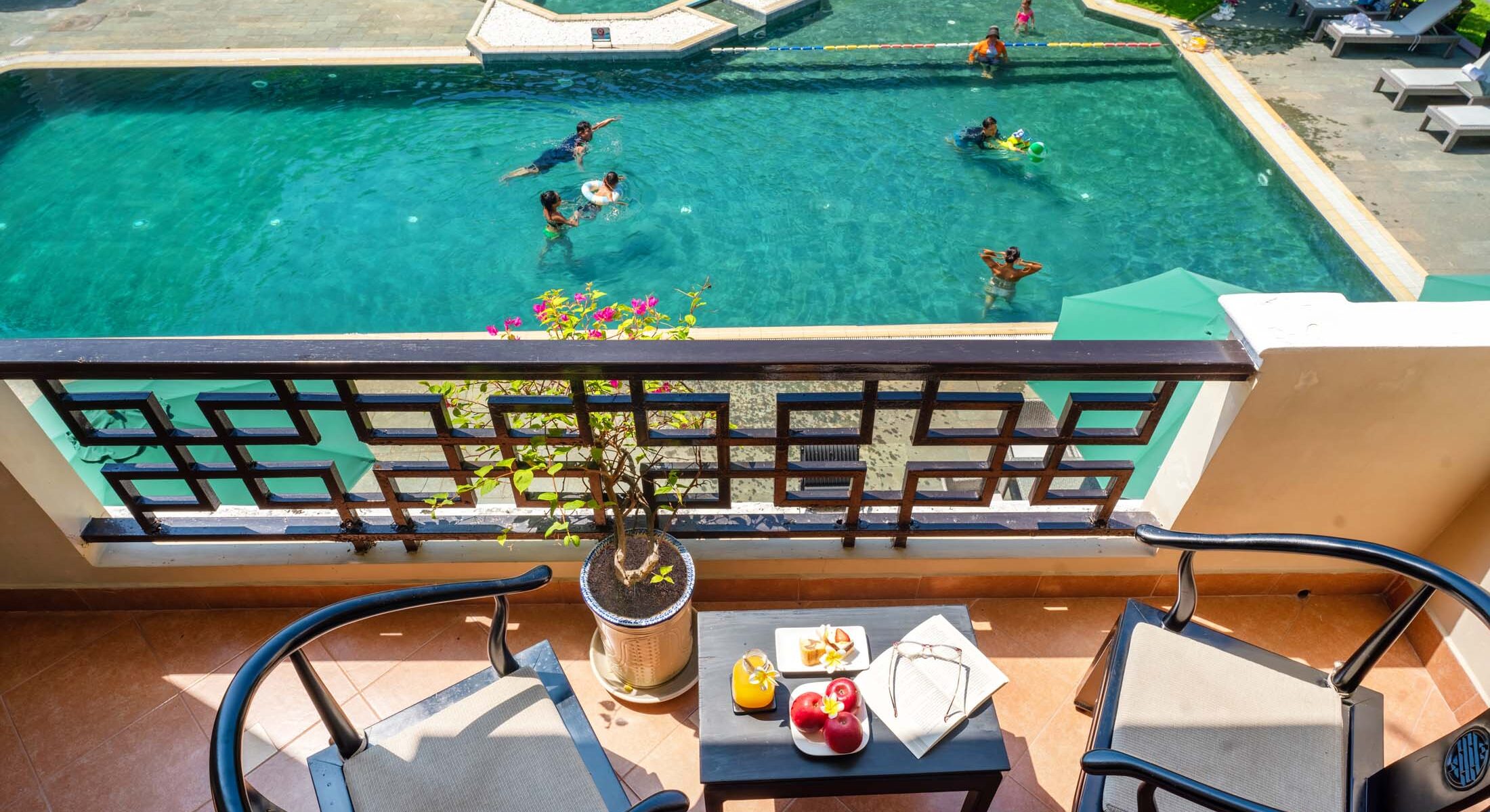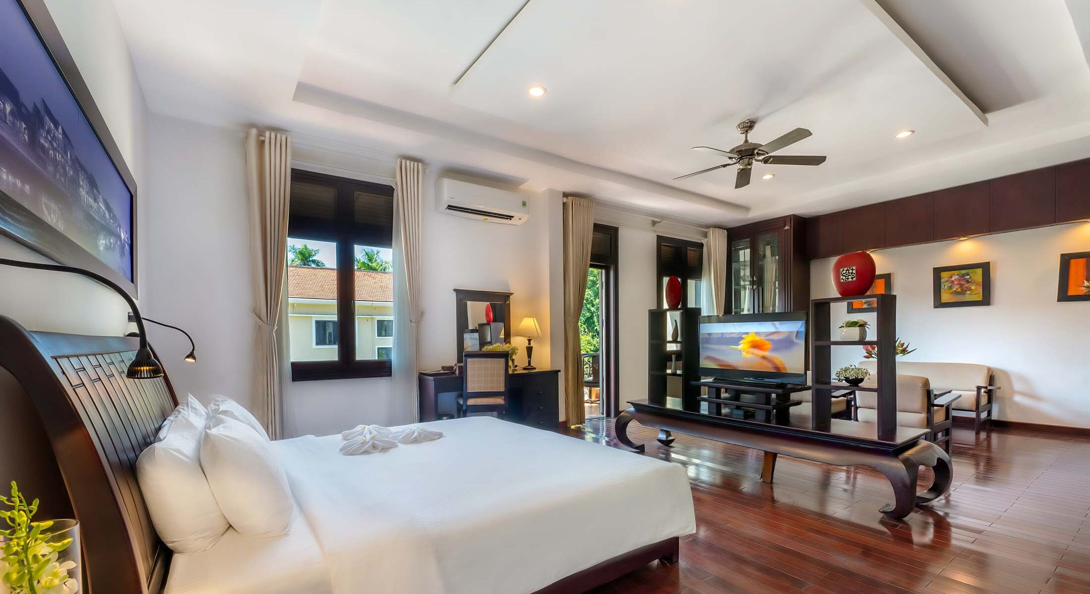 Offering over 56 sqm of graceful comfort, our Suite includes a spacious living room and overlooks the tranquil garden and inviting pool. The interior is adorned with custom dark-wood furnishings, soft tones, and distinctive regional artworks that reflect the heritage of Hội An. Designed to feel like a true home away from home, the suite provides an elevated stay for guests who appreciate space, serenity, and classic elegance.