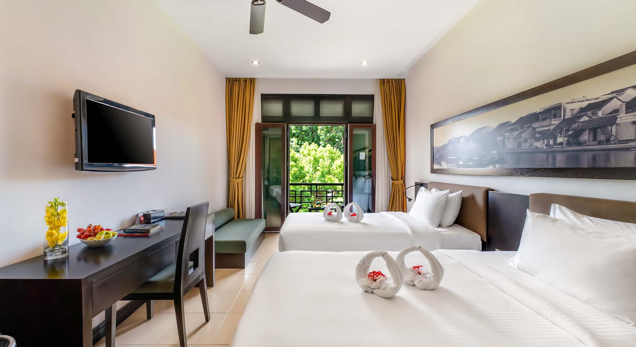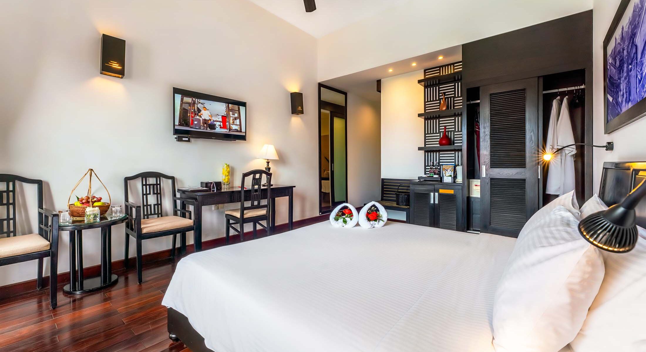 The Superior Room offers a bright, spacious setting thoughtfully designed for both relaxation and convenience. A comfortable bed, flat-screen TV, adjustable air-conditioning, and customizable lighting ensure a pleasant stay any time of day. The bathroom features practical amenities such as heated mirrors for added comfort. With calming garden, pool, or city views, this room provides an inviting retreat for your holiday or business stay in Hội An.
