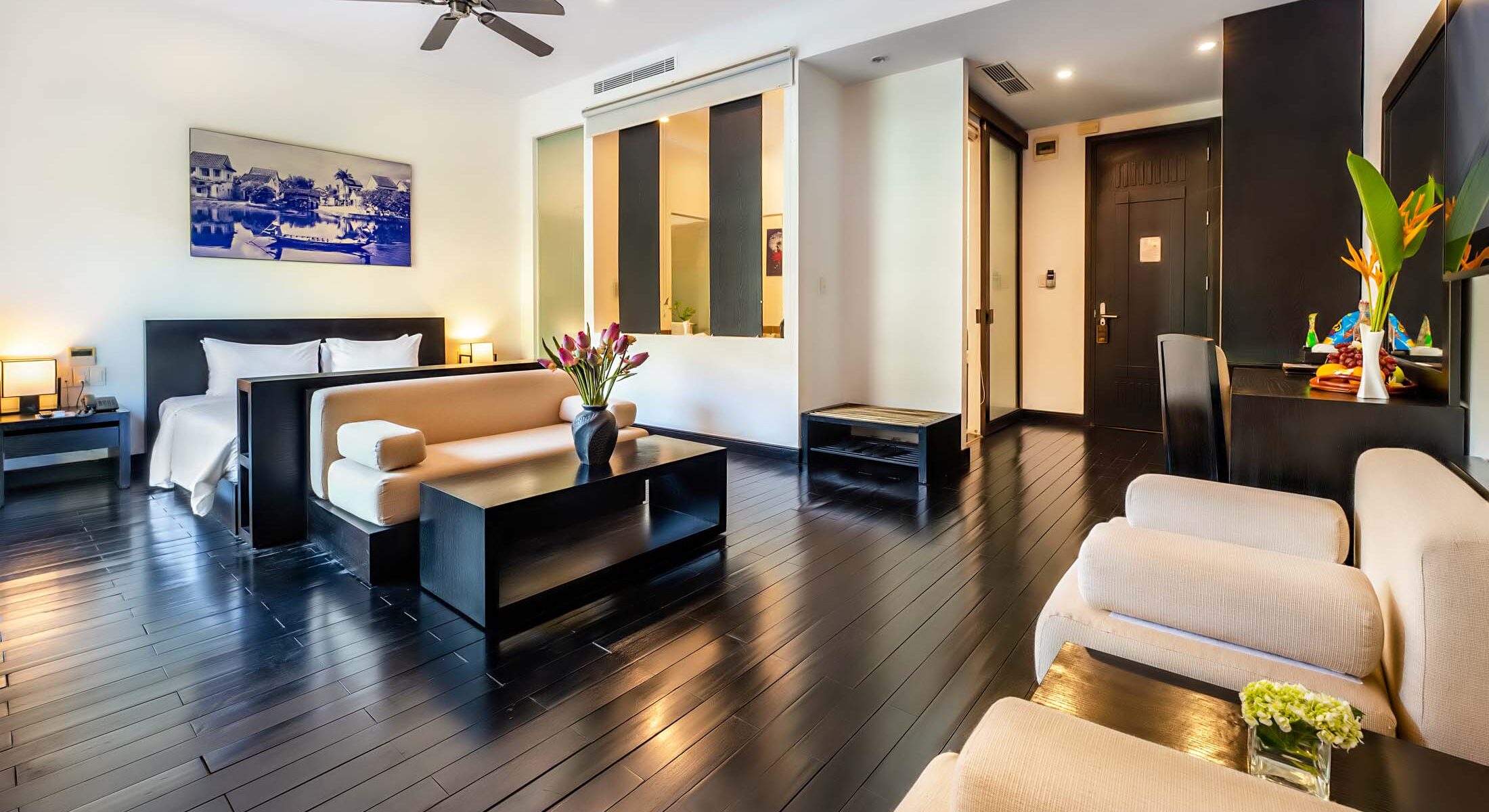 Junior Suite mở ra một không gian nghỉ dưỡng rộng rãi và yên tĩnh, phù hợp cho những ai tìm kiếm sự riêng tư cùng cảm giác thư thái trọn vẹn. Thiết kế hài hòa giữa nét duyên di sản và đường nét hiện đại mang đến bầu không khí nhẹ nhàng, dễ chịu. Phòng được trang bị giường cỡ lớn êm ái, TV LCD 32 inch cùng khu vực phòng tắm riêng rộng rãi, đáp ứng tiêu chuẩn tiện nghi sang trọng. Từ phòng, du khách có thể chiêm ngưỡng khung cảnh hồ bơi xanh mát hoặc khu vườn nội khu thanh bình – nơi lý tưởng để thả lỏng nhịp sống và tận hưởng những khoảnh khắc nghỉ ngơi chậm rãi giữa lòng Hội An.