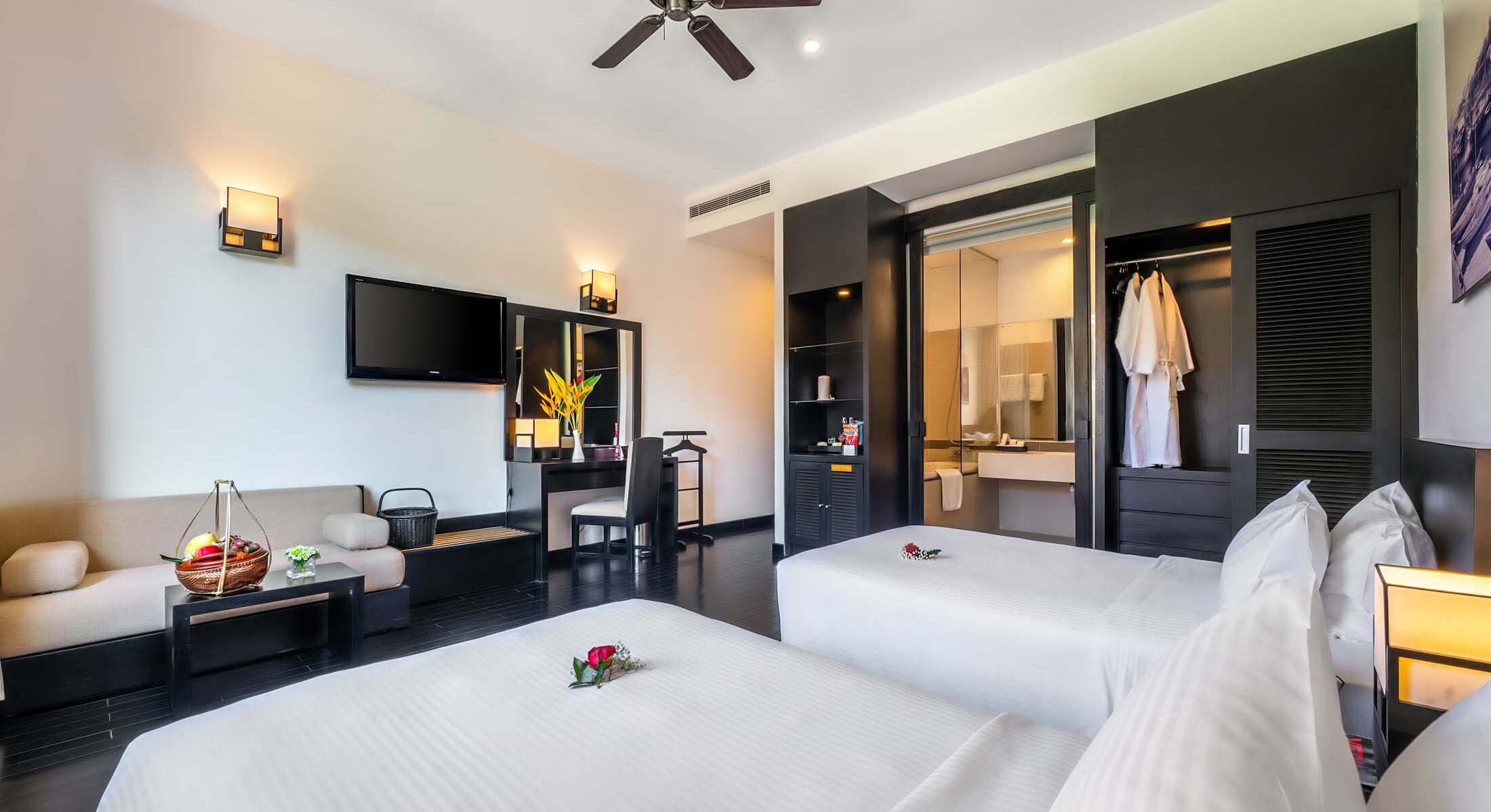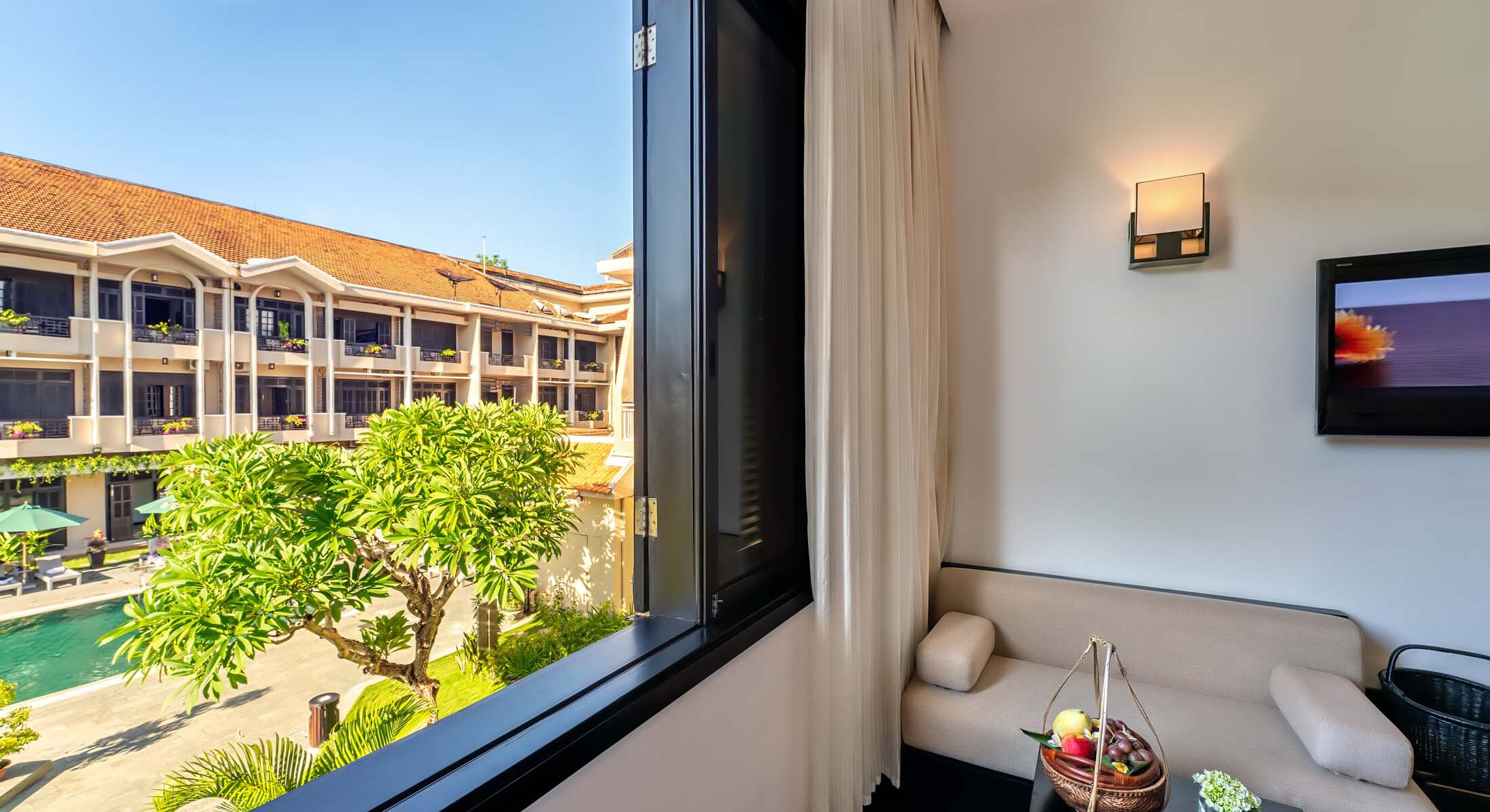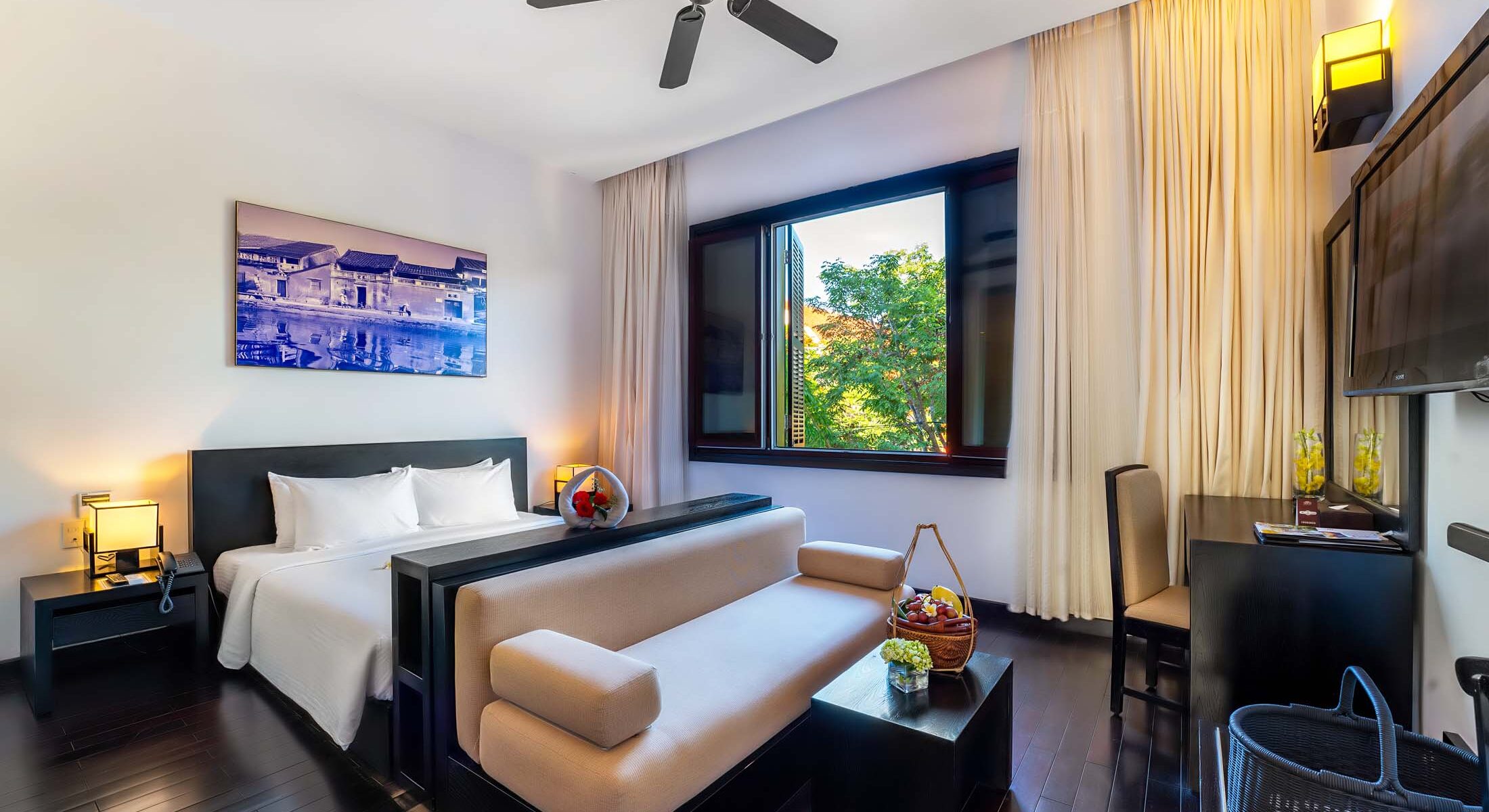 Phòng Premium mang đến không gian rộng rãi, trang nhã, được thiết kế dành cho những vị khách đề cao sự riêng tư và gu thẩm mỹ tinh tế. Phòng được trang bị giường cỡ lớn êm ái, TV LCD 32 inch cùng phòng tắm riêng rộng rãi, đáp ứng trọn vẹn nhu cầu nghỉ dưỡng thoải mái. Những ô cửa sổ lớn đón trọn ánh sáng tự nhiên, mở ra tầm nhìn hướng khu vườn xanh mát, hồ bơi yên tĩnh hoặc nhịp sống sinh động của khu vực trung tâm, tạo nên bầu không khí thư thái suốt thời gian lưu trú tại Hội An.